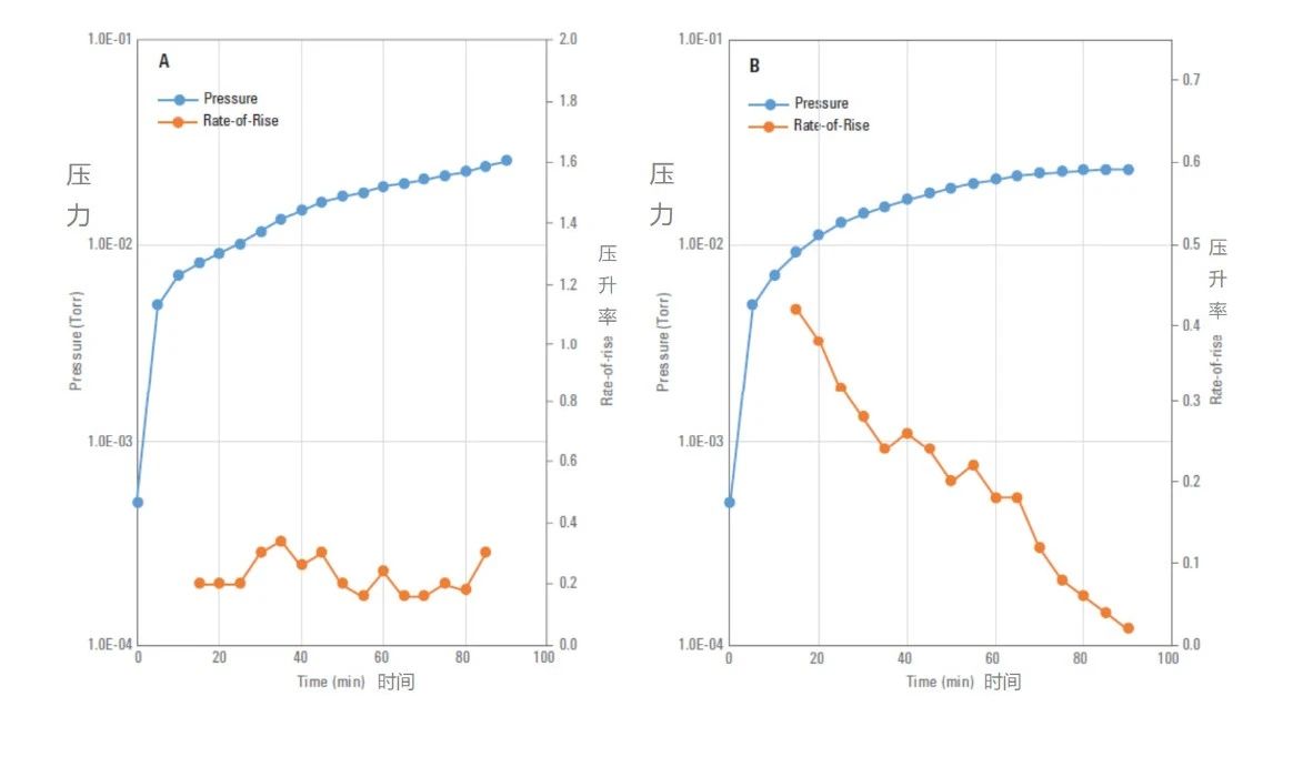 如上圖中的系統(tǒng)A,如果多次測量的壓升率基本恒定不變,那么很可能系統(tǒng)有真實的泄漏。對應(yīng)的,如上圖中的系統(tǒng)B,隨著時間的推移,其壓升率下降,即系統(tǒng)壓力的增加速度會隨著時間的推移而減慢,則暗示有虛漏或放氣(可能也有小的泄漏)。
